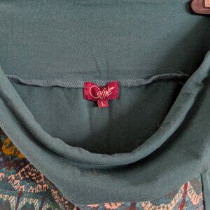 Cute teal green with false wrap panel in abstract pattern, poly/cotton blend. Stretchy - flat measurements pictured.