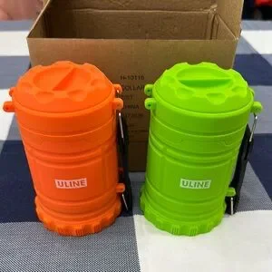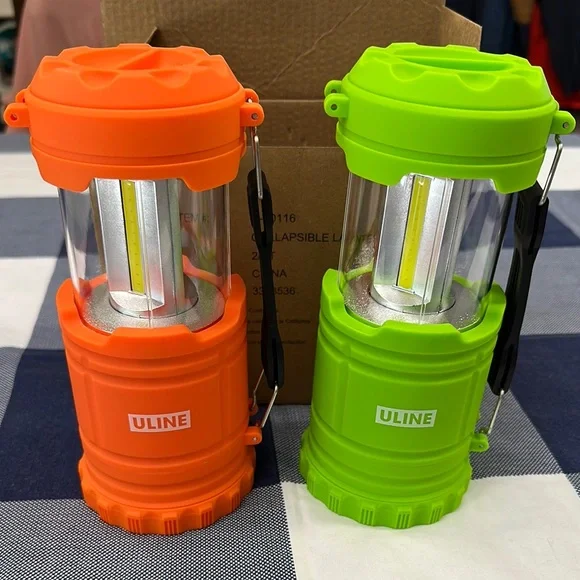 The Collapsible Lantern Set. Featuring vibrant orange and green colors, these lanterns are perfect for outdoor adventures or emergency use. Compact and easy to store, they provide reliable lighting wherever you need it.