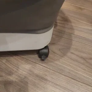 Container collapses for storage and is on wheels with locks for easy movement. Features a top hinge lid to access food and a snap on and off lid to refill