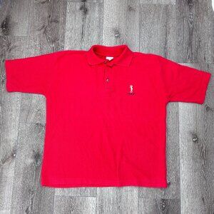 Red collared T-shirt. Embroidered Golfer.