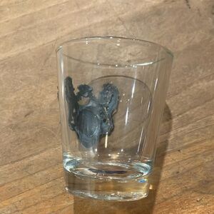 Clear glass with affixed metal coat of arms and colourful badge with image of the celebrated hotel and landmark.