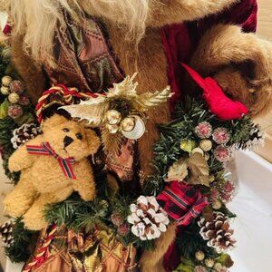 - Decorative ornaments of teddy bear, bird, bells, pine cones, berries, and ornate glass ball ornaments cascade down the front of Father Christmas' robe.