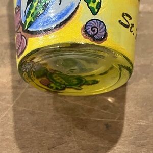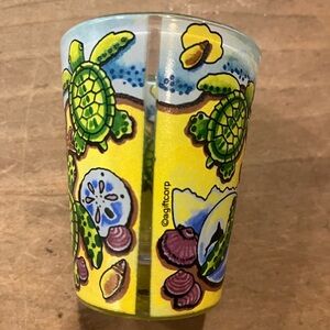 Colorful shot glass featuring turtles and St. Maarten design. Vibrant yellow and green hues.