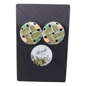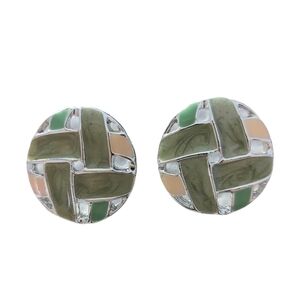 These vintage earrings feature a basketweave design with green and peach enamel on silver-toned metal. In excellent condition, perfect for adding a touch of retro style to any outfit.