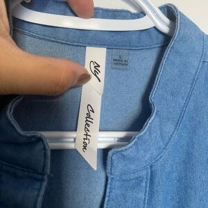 Soft denim-look blouse with button-front closure. Ruffled cap sleeves add feminine detail. Lightweight fabric with gentle drape. Versatile for casual or polished outfits.