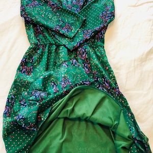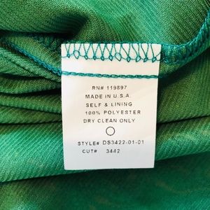 It features a faux wrap top, 3/4 length sleeves, and elastic empire waist with lined skirt.