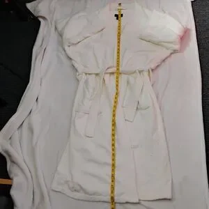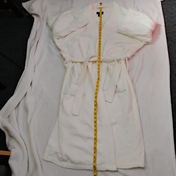 Soft white robe by Collective Concepts. Features a tie belt and two front pockets. Perfect for lounging.