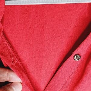 Semi sheer coral red sleeveless blouse with a rounded & softly pleated collar. Hidden buttons complete this sleek top!