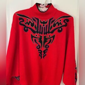 Kansai embroidered red wool batwing sweater. Mock turtleneck. Extremely rare. Excellent condition. One VERY small irregularity as shown in last pic.