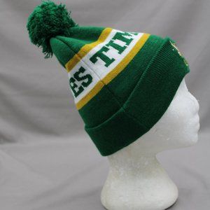 Up for sale is a UNBC Timberwolves toque. It has a green base colour with a white midsection. The middle of the toque has Timberwolves woven in that wrap around the body of the toque. The lower portion of the toque has the UNBC logo crested on. What a great toque do not miss out on it.