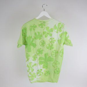 A crew neck t-shirt hand-printed in acid green with a daisy motif, featuring a playful lucite O-ring detail at the front centre hem.