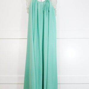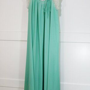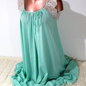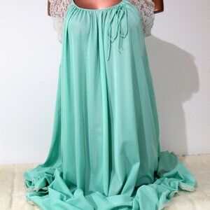 Gorgeous Colony Club vintage nightgown, in excellent vintage condition. Very soft silky green nylon embellished with pretty lace accents. No size tags present, but the underarm to underarm measurement is 22 inches...I think it would fit size medium to large (up to 38 inch bust) quite well. Length is 48 inches from top of shoulder to lacy hem.