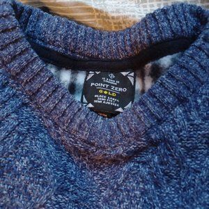 A warm cozy knit sweater in a nice color-block design. Regular fit. Warn a few times only, never washed. Little to no pilling. The fit is regular.