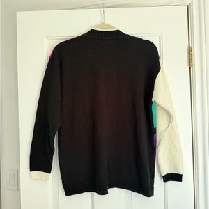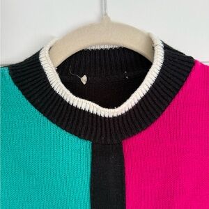 Stylish color block sweater featuring vibrant teal, magenta, purple, black and white sections. Perfect for adding a pop of color to your wardrobe this Fall. No tags but fits like a women’s medium.