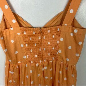 Color Me Courtney Orange Polka Dot Cutie Maxi Dress in Women's Size 2. Retails for $250 USD (approximately $348 CAD). Beautiful tiered style with flattering layers. Wide straps. V-neckline. Smocked back with zipper closure. 98% cotton and 2% spandex. Lined with cotton. Dry clean. Very good pre-loved condition. No visible flaws.