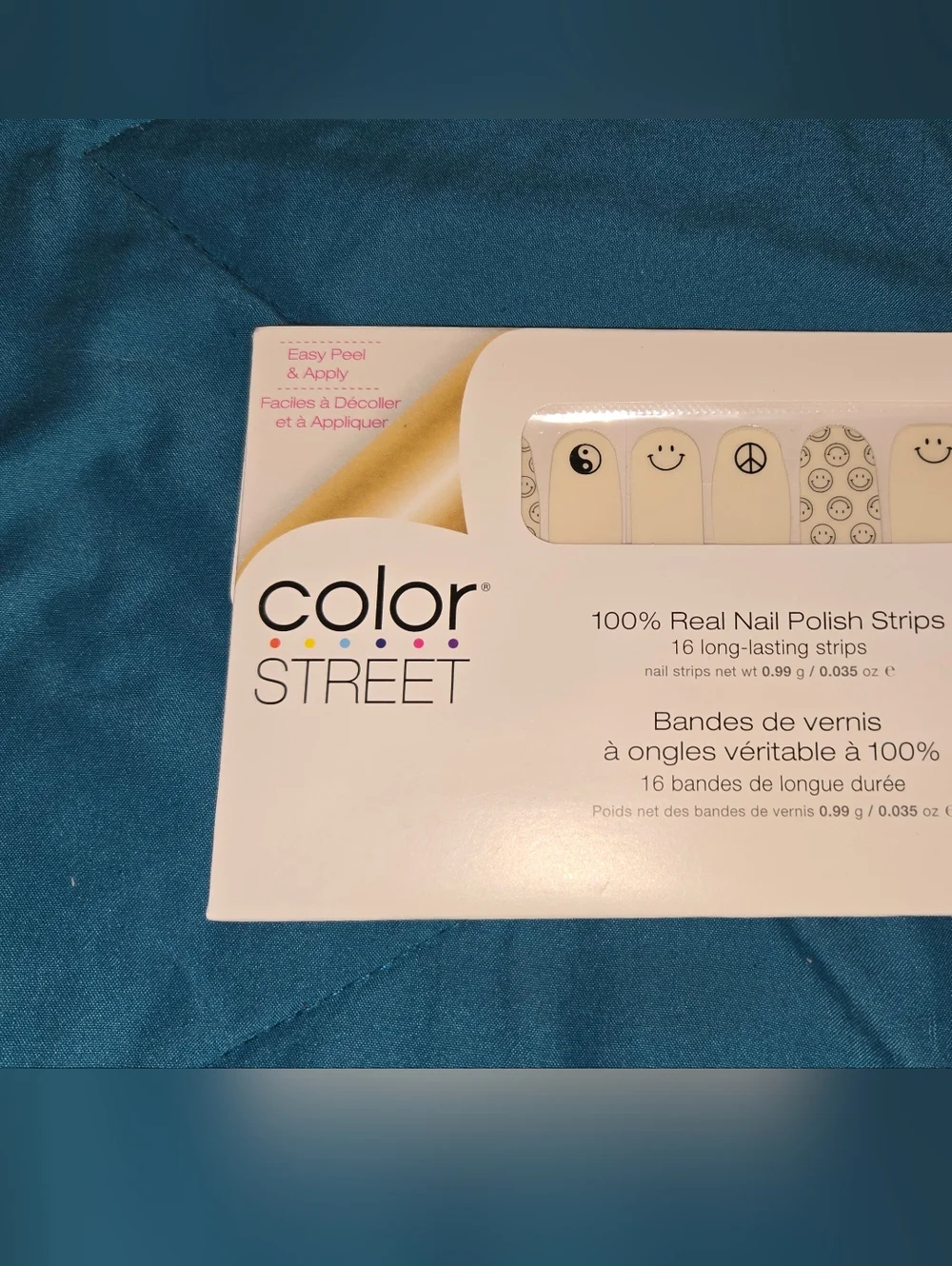 Peel-and-apply nail polish strips. White base with black smiley, peace and and yin-yang symbols. Bold graphic manicure in minutes.
