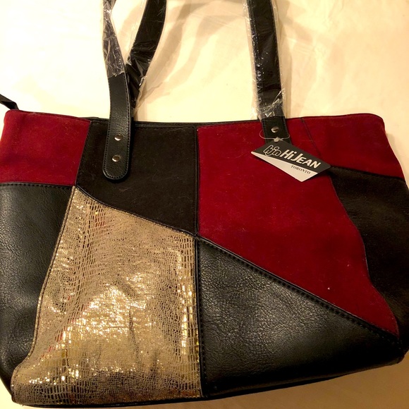 Leatherette and suede color block large purse with metallic detail.