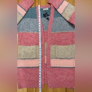 NWT - This soft colorblock open cardigan features a stylish blend of pink, gray, and cream, it's perfect for layering over any outfit. Ideal for both casual and relaxed settings. Large front pockets.