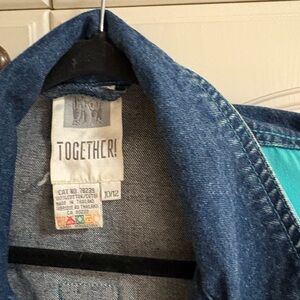 Stylish colorblock denim jacket with vibrant panels. Features shades of purple, teal, and blue. Perfect for a bold fashion statement.
