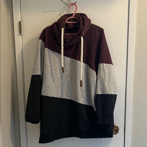 Stay cozy and stylish with this colorblock hoodie sweatshirt. Featuring a blend of burgundy, gray, and black, it's perfect for casual outings.