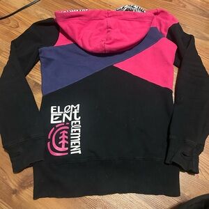 Stylish colorblock hoodie featuring pink, black, and blue panels. Includes a logo on the chest and a patterned hood lining.