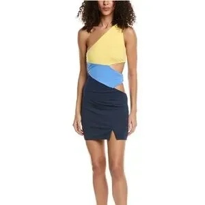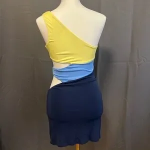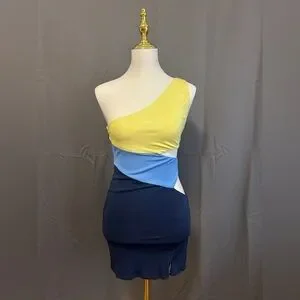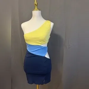 Make a statement in this bold and vibrant one-shoulder mini dress featuring a striking colorblock design in yellow, sky blue, and navy.