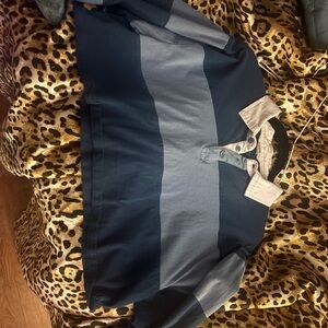 Stylish colorblock polo shirt with button details. Features shades of blue and cream.