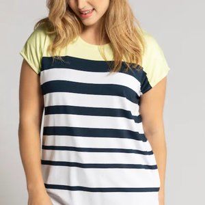 Colorblock Stretch Knit Top - bold stripes with a solid yoke and a gracefully oversized silhouette. Round neck, short dolman sleeves, round hem, and side vents. Soft silky stretch knit.