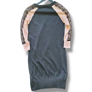 Cute mini length sweater dress w charcoal grey main, peach/pink sleeve w black lace overlay