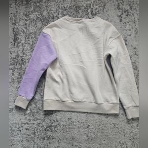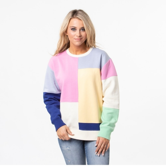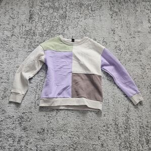 Trendy colorblock sweatshirt. Features purple, brown, sage and cream panels.