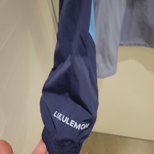 Stylish colorblock jacket featuring shades of blue and gray. Perfect for a chic and modern look.Folds into a convenient fanny pack!