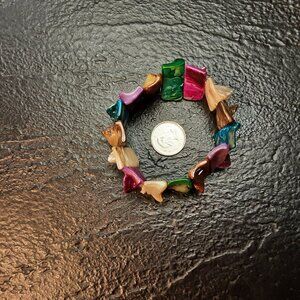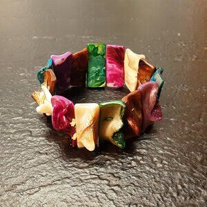 Vibrant abalone shell stretch bracelet featuring stunning natural colors and a textured finish. The bracelet showcases a kaleidoscope of iridescent hues, including greens, pinks, purples, golds, and creams, adding a touch of elegance to any outfit. Each shell piece varies in color and texture, creating a truly one-of-a-kind design. The bracelet is 1.3 inches wide and weighs 62 grams, offering both substance and comfort. Perfect as a statement accessory or a thoughtful gift for lovers of natural jewelry.