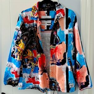 Vibrant jacket with abstract art design. Features bold colors and unique patterns. Perfect for making a statement. This is a very light jacket. Where is the tag is a pocket and the jacket can get packed in that little pocket! Perfect for traveling. Is new but I took the tag off and never worn it. Loose fit.