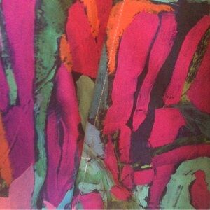 Vibrant button-up shirt with an abstract design. Features a mix of colors including green, blue, pink, and purple. Perfect for adding a pop of color to any outfit.