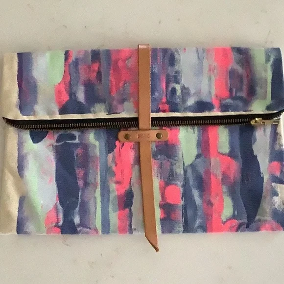 Vibrant clutch with abstract design. Features a mix of pink, blue, and green colors. Stylish and unique accessory. Purchased in Australia from an Artisan. The clutch is hand painted and one of a kind. Strap is leather. When folded it measures 8x12