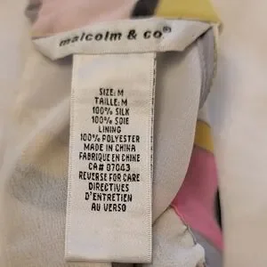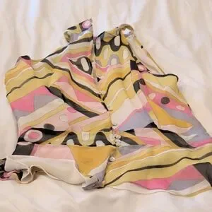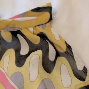 Vibrant halter top with abstract patterns. Features pink, yellow, and black colors.
