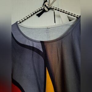 Vibrant long sleeve top with abstract design. Features bold red, yellow, and gray colors. Perfect for a statement look.
