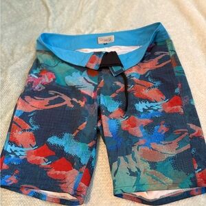 Vibrant swim shorts with an abstract design. Features shades of blue, red, and green.