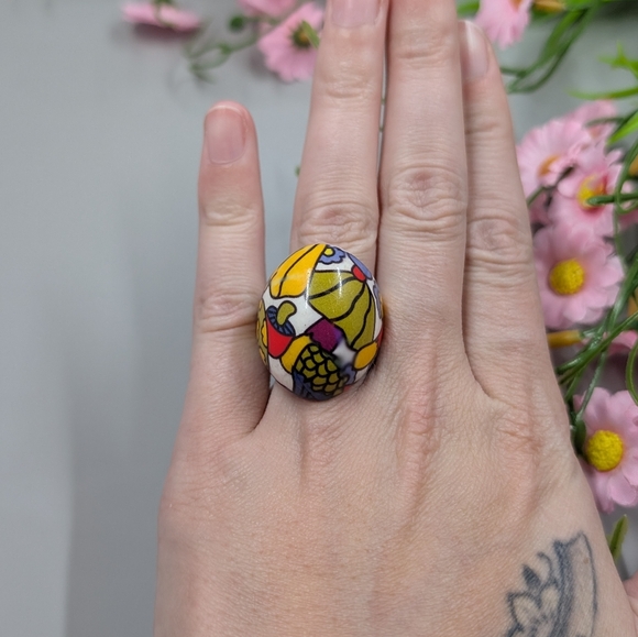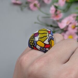 Add a pop of color to your outfit with this vibrant abstract pattern ring. Perfect for any occasion. Approximately size 7
