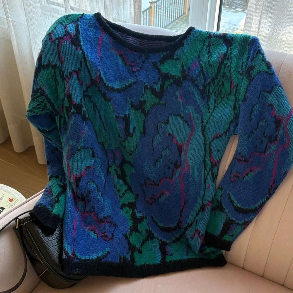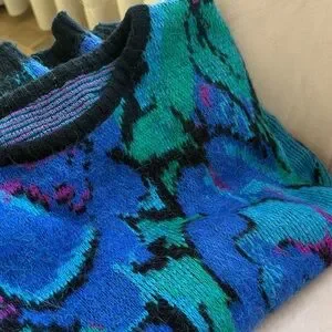 Unique abstract patterned vibrant sweater. Georgeous hues of blue, green and fuchsia. In good vintage condition. Would fit xs/s