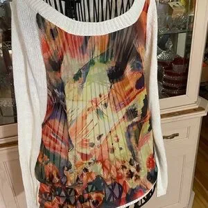 Vibrant sweater with an abstract print. Features a mix of colors including red, orange, and green. Perfect for adding a pop of color to your outfit.