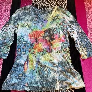 Vibrant top with an abstract print and bell sleeves and loose fit and V Neckline!