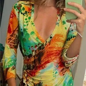 Vibrant dress with an abstract print. Features a mix of yellow, orange, green, and red colors. Perfect for a bold look. Low v neck, super stretchy soft material.