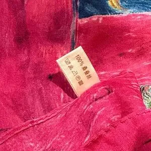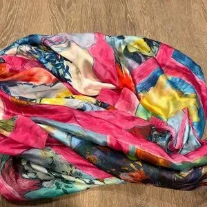 Vibrant scarf with abstract patterns. Features pink, blue, and yellow hues. Floral designs
