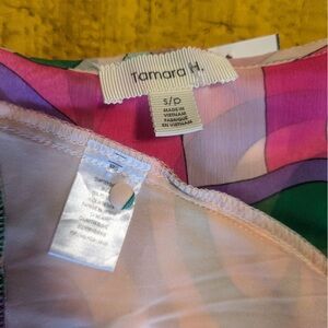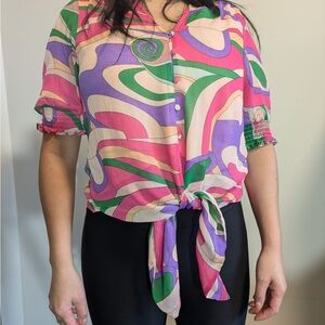 Vibrant blouse with abstract patterns. Features a tie-front design. Perfect for a bold look.