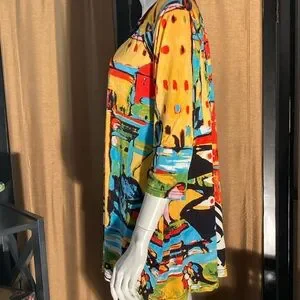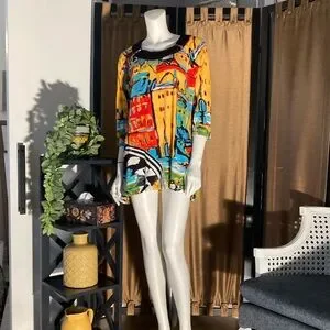 Vibrant tunic with abstract patterns. Features a mix of yellow, blue, red, and black colors. Perfect for a bold look. This top is an XL and very loose fitting so it would likely fit 2X as well.
