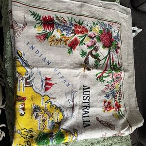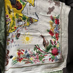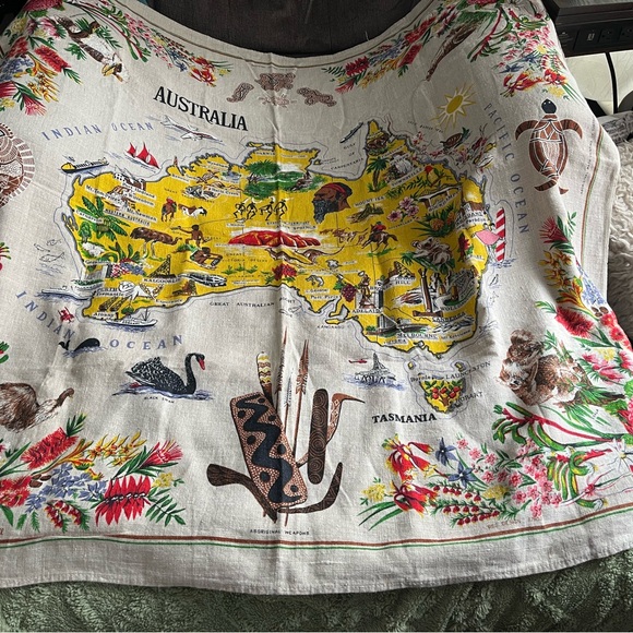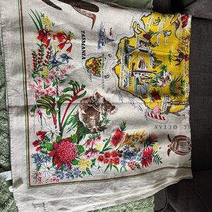 Two retro tablecloths with detailed map of Australia. Includes illustrations of native animals and landmarks. Larger tablecloth is linen, smaller tablecloth is cotton. Neither have ever been used and have no stains. Price includes both tablecloths.