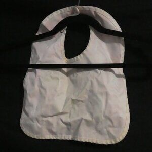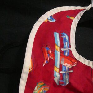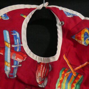Vibrant bib featuring playful illustrations on a red background, trimmed with a soft cream border
