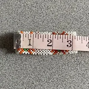 Vibrant beaded bracelet with orange, green, and white beads. Perfect for adding a pop of color to any outfit.