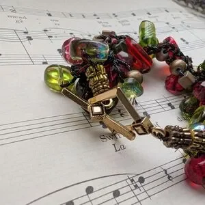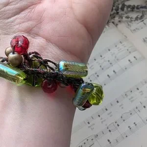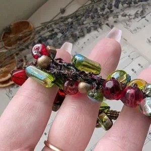 Add a pop of color to your outfit with this vibrant beaded bracelet. Featuring a mix of red, green, and gold beads, this accessory is perfect for any occasion.